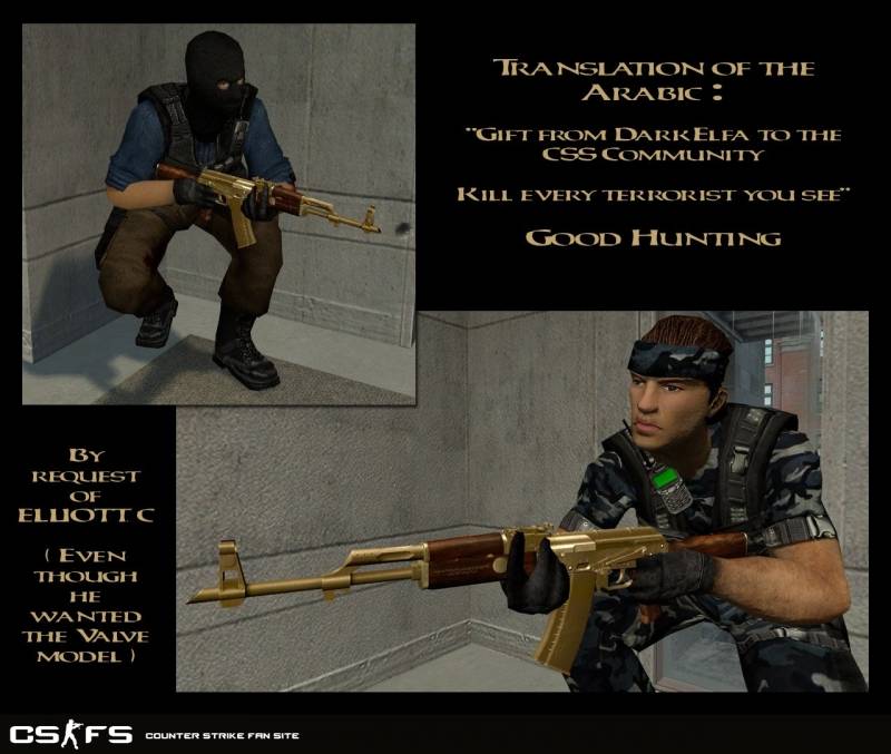 Gold Saddam AK Elfa Style для cs Source. Отличная альтернатива стандартному AK-47, данная модель великолепна и замечательно выглядит в игре,